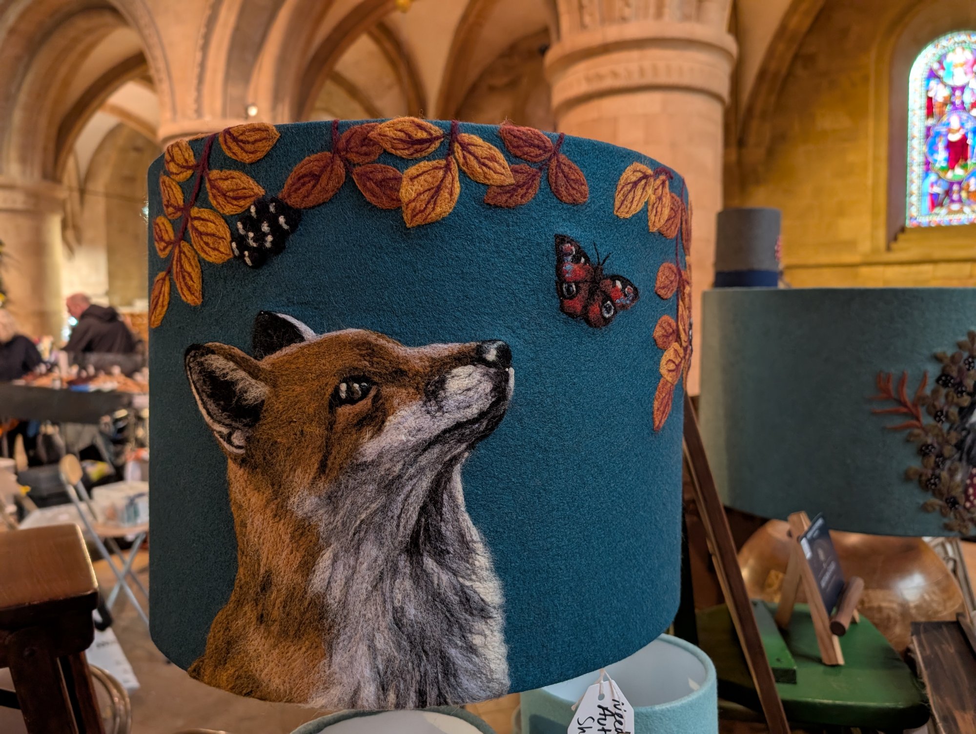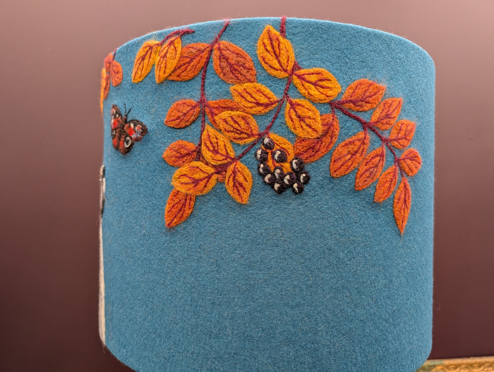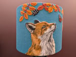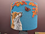 This is a 40cm lampshade featuring a needle felt fox watching a Peacock Butterfly flattering below an Elder tree in it's autumn colours, complete with berries. The background is a teal felt, which won't allow much light through but will create a lovely glow. This size of shade works well in a large table lamp or small standard lamp.