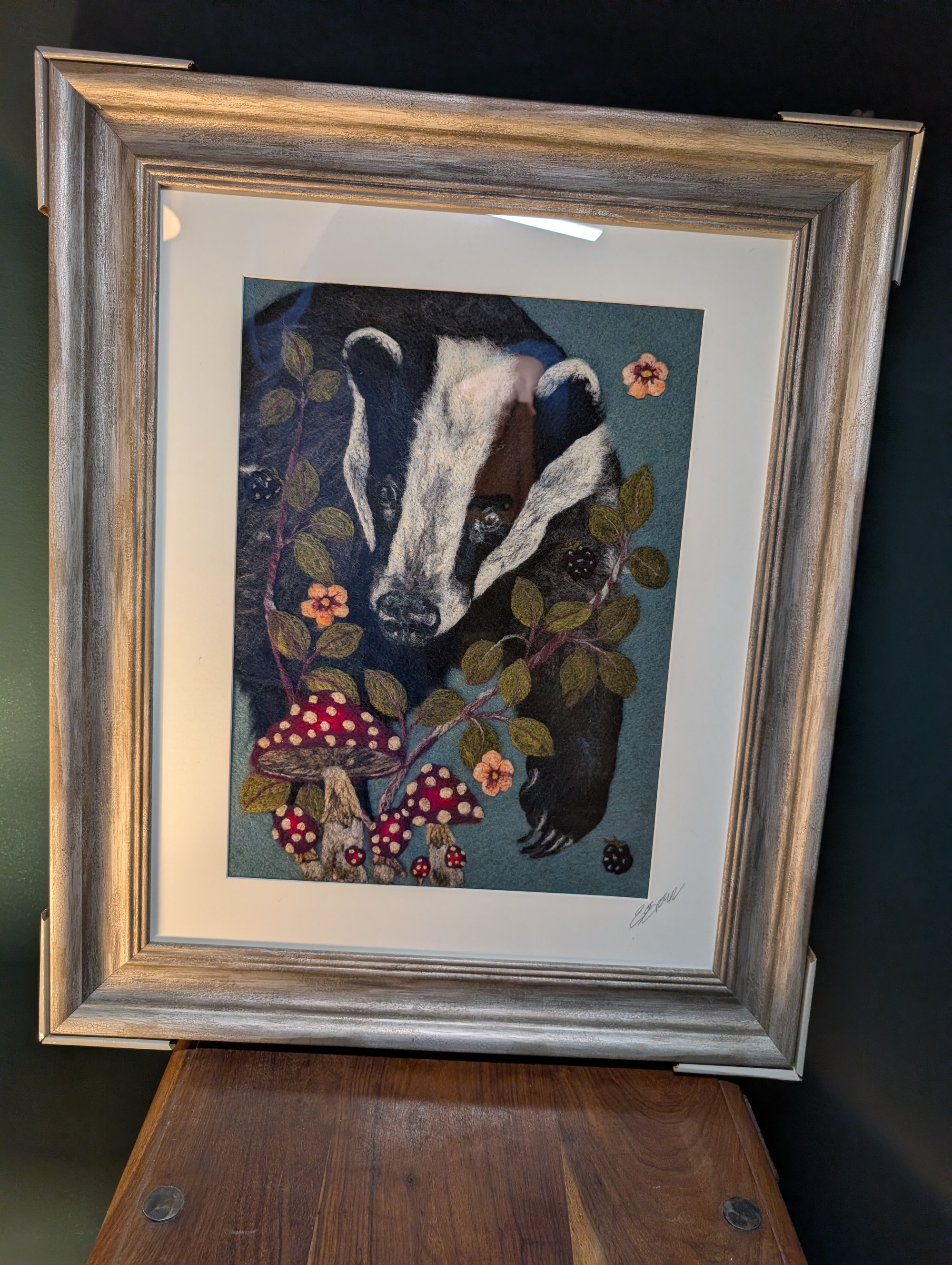 Original needle felt art featuring a badger amongst brambles and toadstools on a duck egg blue felt background.