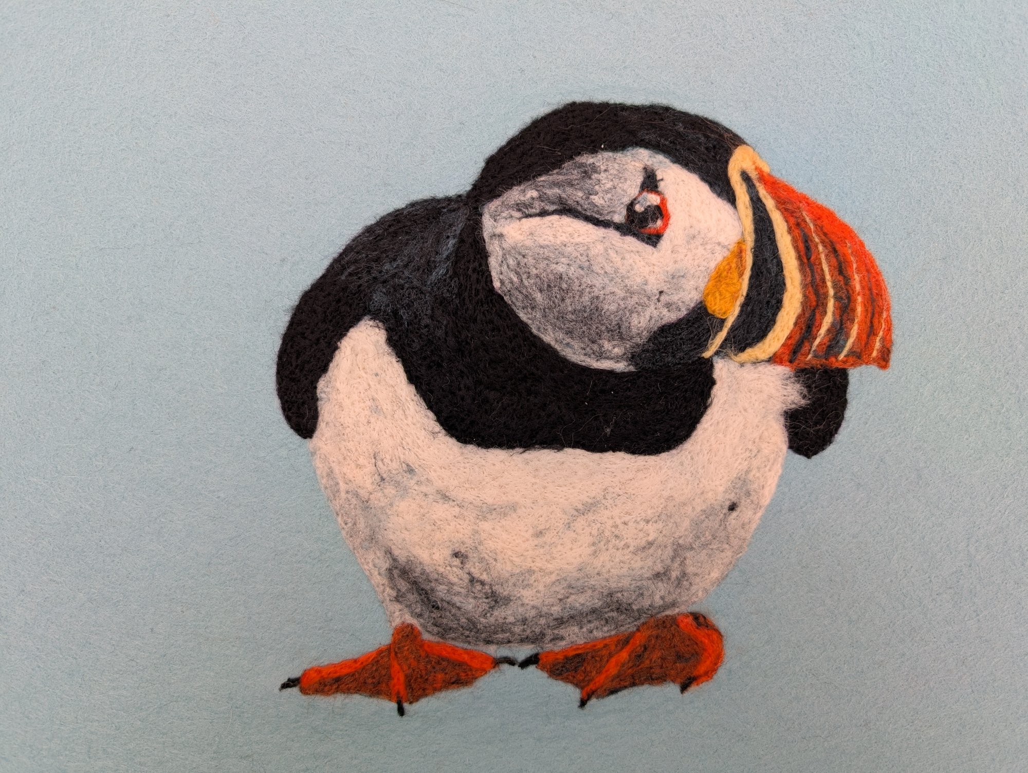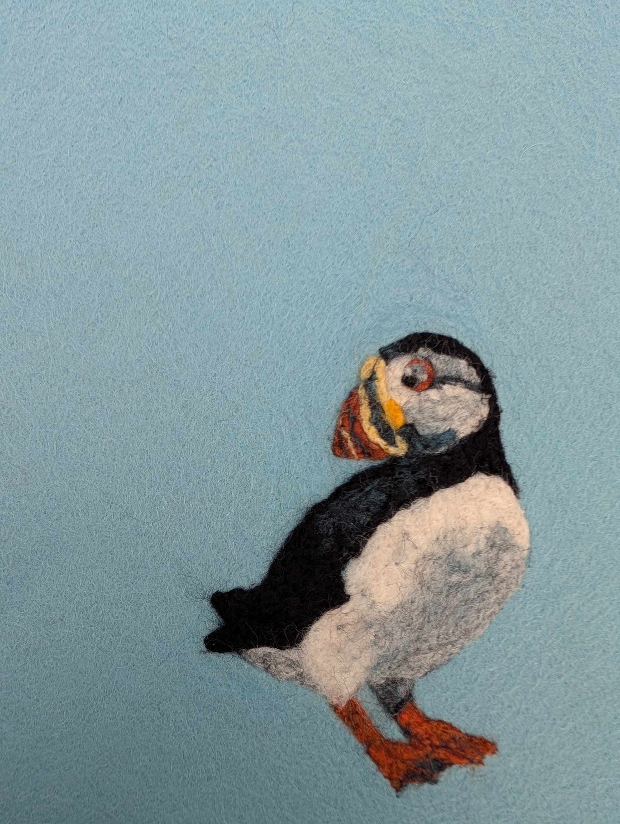 30cm ceiling shade featuring needle felt puffin on a light turquoise felt background