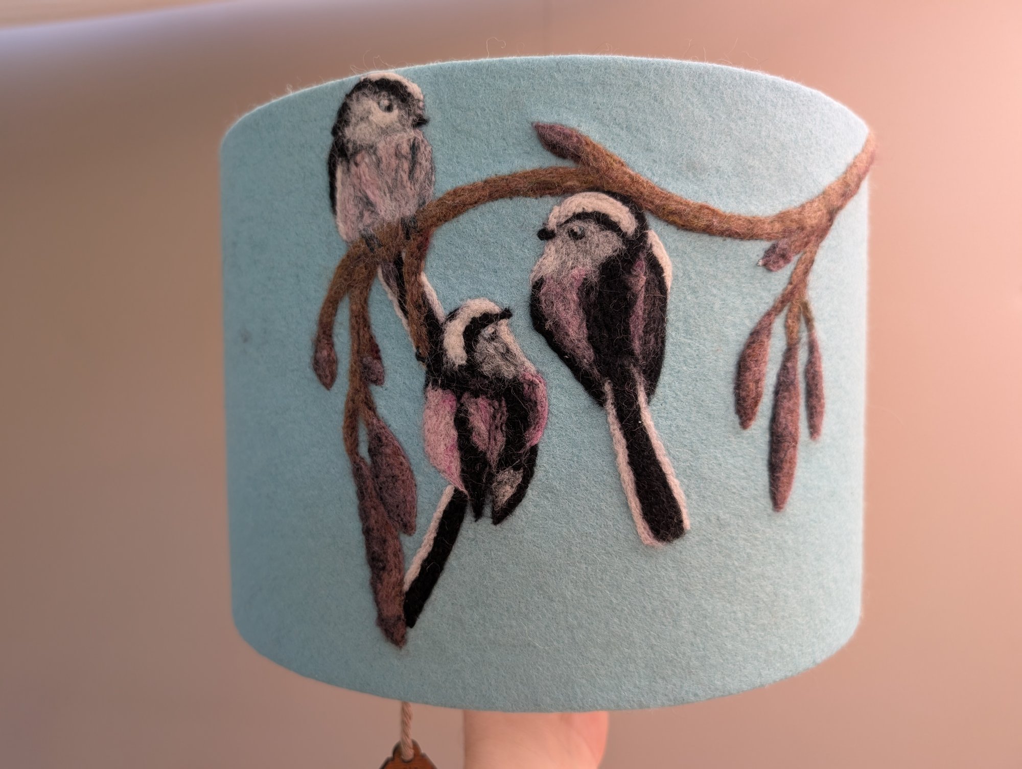 30cm lampshade featuring needle felt long tailed tits on a light turquoise blue felt background.