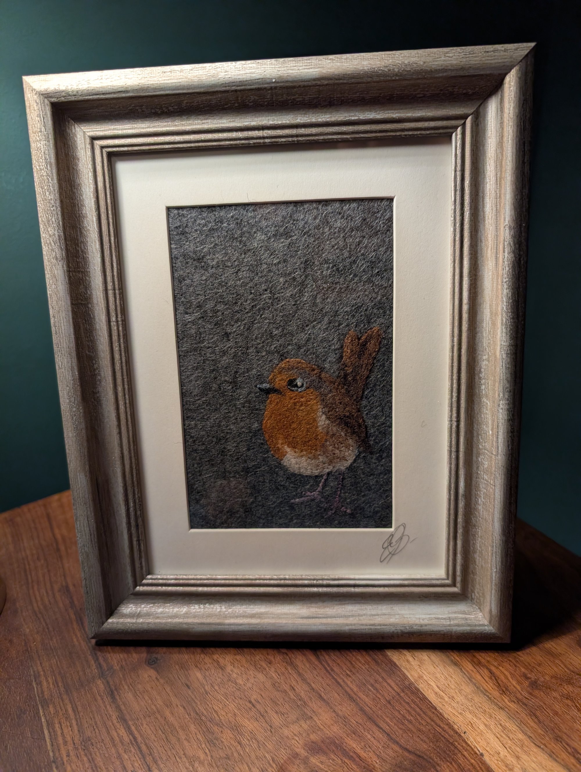 Original needle felt art featuring a robin on a charcoal grey felt background.