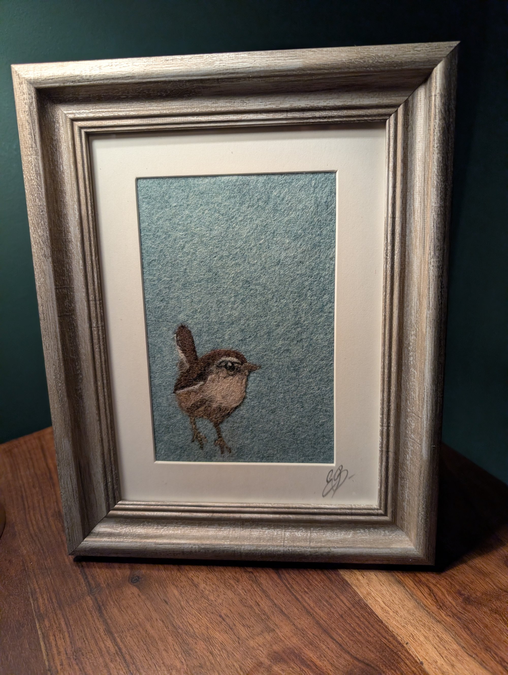 Original needle felt art featuring a wren on a duck egg blue felt background.